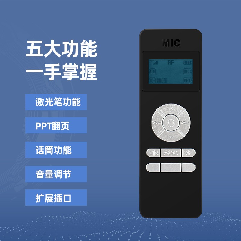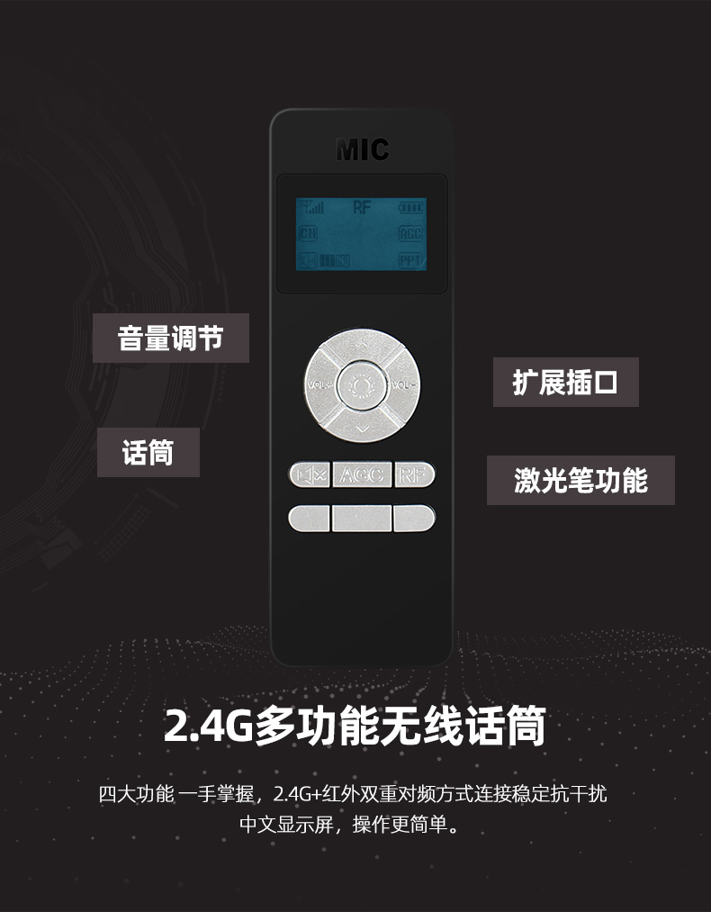 7、無(wú)線話筒其有激光教鞭功能同時(shí)具有上下翻頁(yè)按鍵〔選配翻頁(yè)模塊可實(shí)現(xiàn)無(wú)線翻頁(yè)、在放影PPT文件時(shí)還可一鍵黑屏);