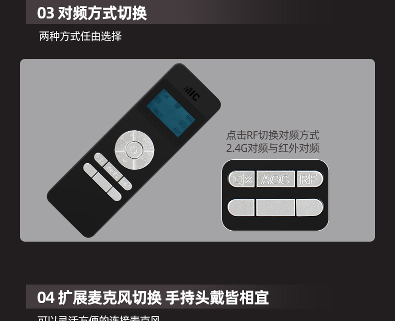 6、無(wú)線話筒采用內(nèi)置麥克風(fēng)設(shè)計(jì),可支持頭帶麥/手持麥輸入;