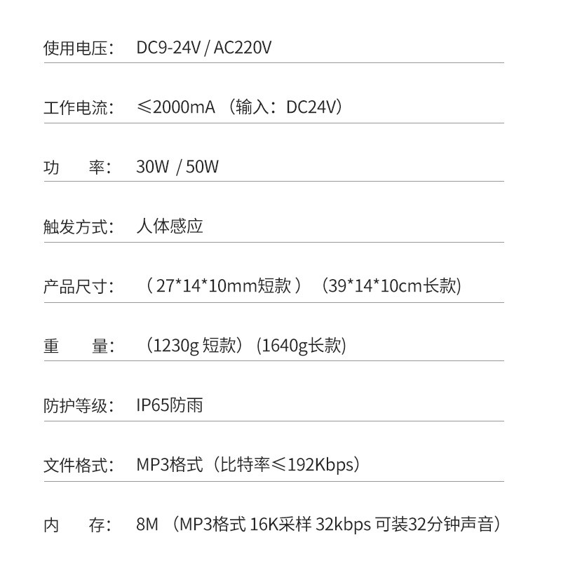 50W戶外語音音柱自定義語音提示器,多路開關(guān)量觸發(fā)RS485串口控制,音量大音質(zhì)好聽清晰,適用于各種安全提示場景,如景區(qū) 公園 道路口 車站 商場等等語音提示,講解。供電方式可DC12-24伏 也可以AC220伏