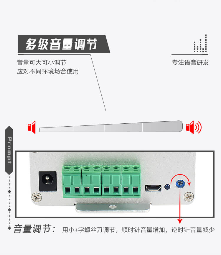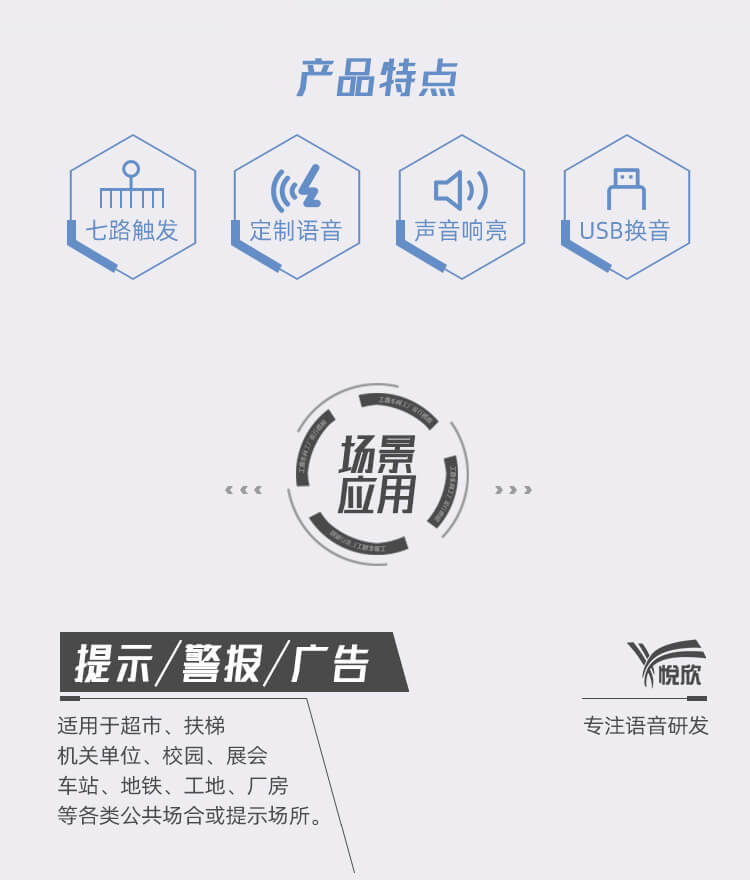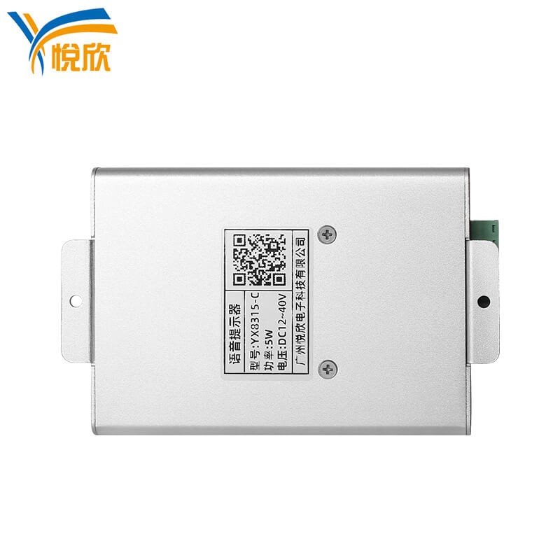 悅欣YX8315自定義語音播放器,屬于工業(yè)語音提示器,接通電源和開關(guān)即可使用,可根據(jù)觸發(fā)端口選擇播放的語音,可USB更新語音文件,本產(chǎn)品適用收費站語音;停車場;升降桿提醒的場合或工業(yè)設(shè)備操作提示;啟動語音;異常提醒等。