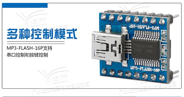 MP3-FLASH-16P串口語音模塊,是一個悅欣自行研發(fā)的一款提供串口和按鍵控制的語音模塊,支持MP3和WAV文件播放。支持工業(yè)級串口通信,以SPI-FLASH 作為存儲介質,提高了產(chǎn)品的穩(wěn)定和可靠性。在支持串口的同時模塊還支持10段語音的指定觸發(fā)播放。