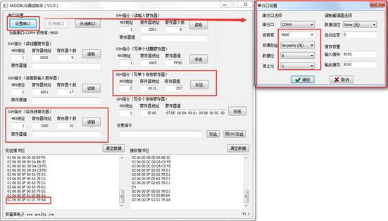 (3)、而根據(jù) Modbus 協(xié)議,當(dāng)寫寄存器的時候,從機(jī)成功完成該指令的操作后,會把主機(jī) 發(fā)送的指令直接返回,我們的調(diào)試精靈會接收到這樣一幀數(shù)據(jù):01 06 00 00 00 01 48 0A。