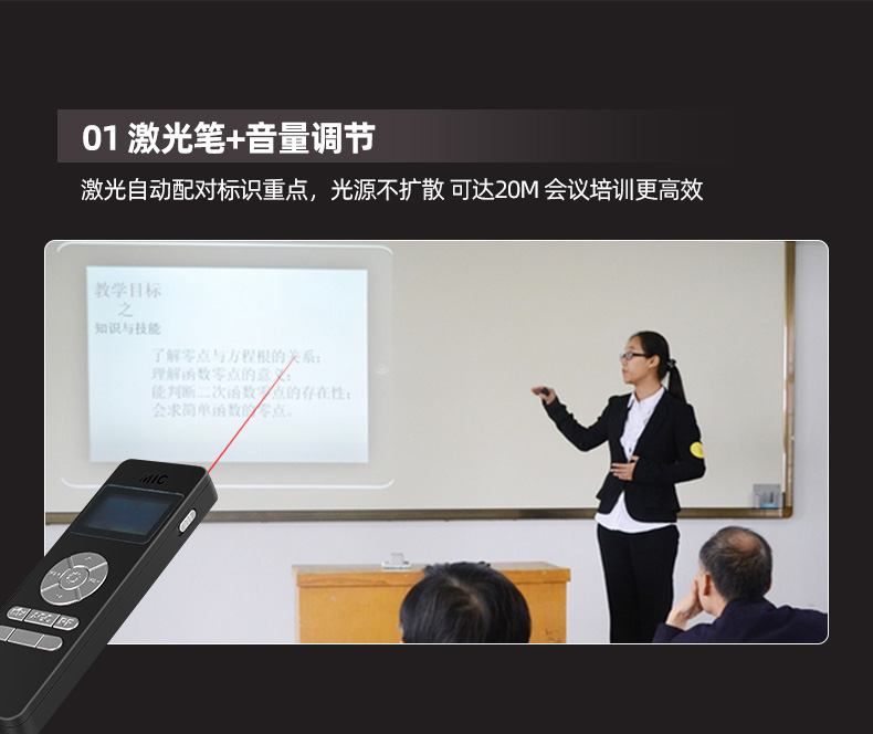 7、無(wú)線話筒其有激光教鞭功能同時(shí)具有上下翻頁(yè)按鍵〔選配翻頁(yè)模塊可實(shí)現(xiàn)無(wú)線翻頁(yè)、在放影PPT文件時(shí)還可一鍵黑屏);