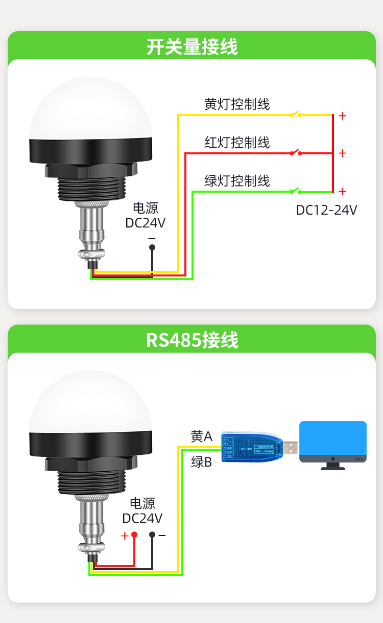 本公司推出的YX5285R(三色燈)聲光報(bào)警器,具有低功耗、長壽命、安裝靈活、方便等特點(diǎn),支持USB自行更換報(bào)警語音文件;本產(chǎn)品支持modbus RTU標(biāo)準(zhǔn)協(xié)議,可以根據(jù)需求以不同的燈光顏色以及閃燈方式搭配相應(yīng)的警示語音來達(dá)到警示報(bào)警等功能。