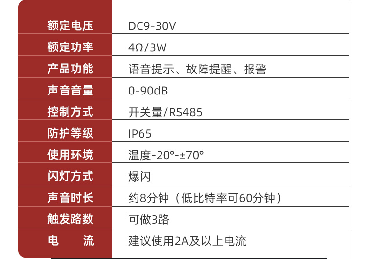 本小型聲光報警系統(tǒng)YX75R采用高亮LED發(fā)光源,防水高頻喇叭,內(nèi)嵌高穩(wěn)定性的MP3主控,具有良好操作性,是一款可USB更換報警內(nèi)容的聲光報警器,。報警器可通過開關(guān)信號控制,或RS485串口控制,應用于家庭、工廠、學校、商鋪、便利店、財務室、別墅、小區(qū)等需要防護的地方,保障人身及財產(chǎn)的安全。